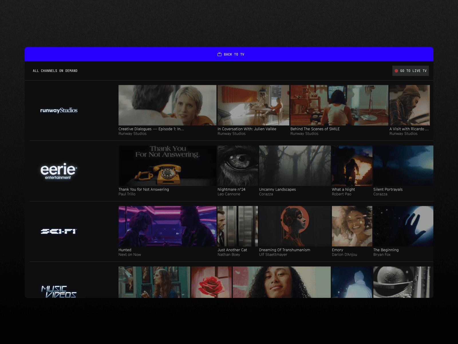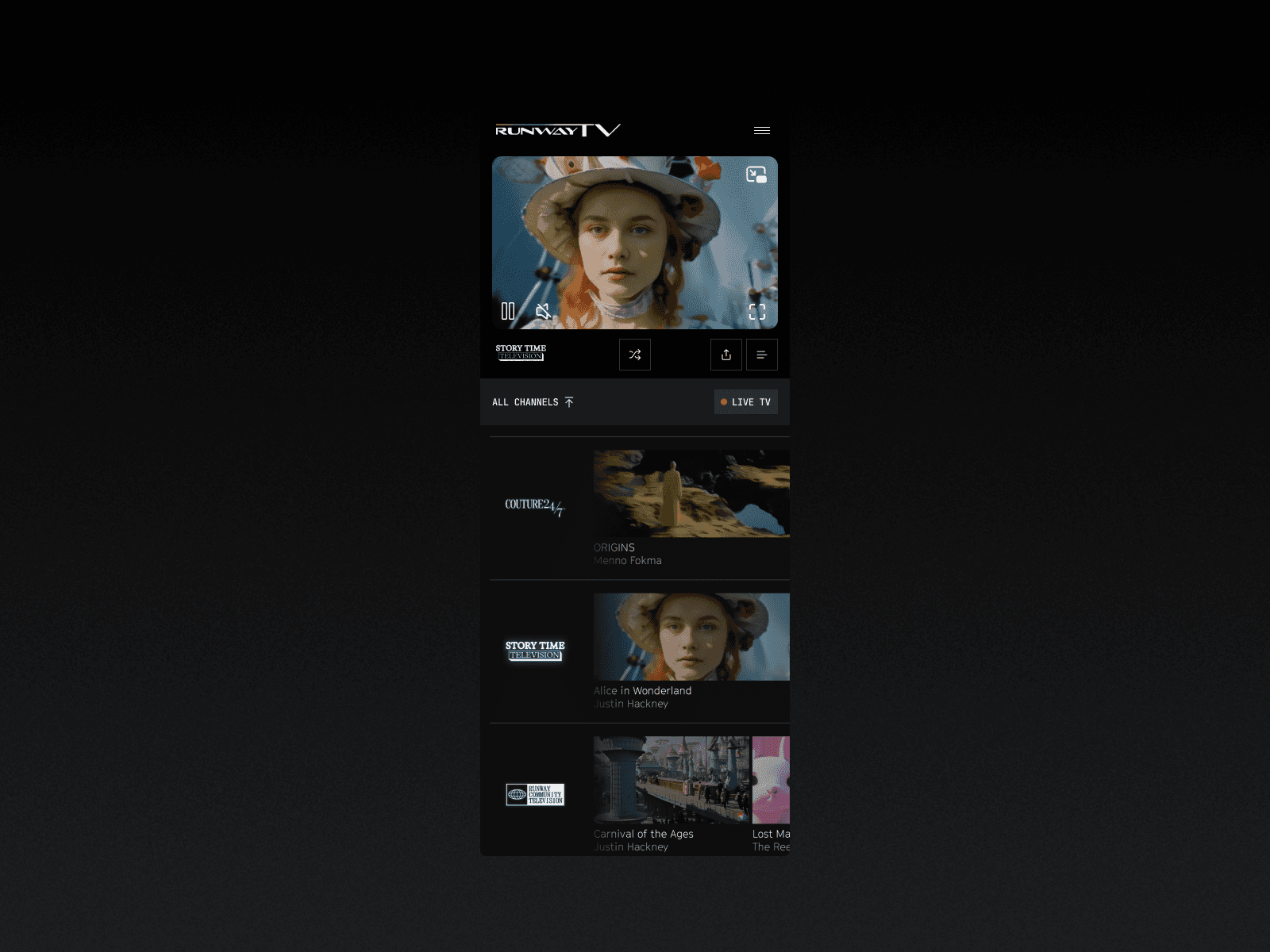 Runway TV IS A 24/7-generated streaming platfom created to showcase promissing experamentations from creators using runway.